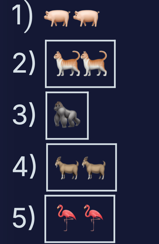 1$)$ 🐖🐖$\quad$ 2) $\boxed{🐈🐈}\quad$ 3) $\boxed{🦍}\quad$ 4) $\boxed{🐐🐐}\quad$ 5) $\boxed{🦩🦩}$
